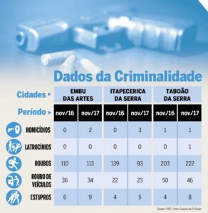Taboão da Serra Número de roubos cai em Taboão, Embu e Itapecerica no ano de 2017 Por Redação • 28/01/2018 Ler mais