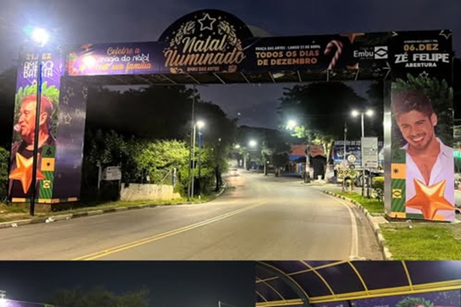 Embu das Artes dará início, no próximo sábado, dia 6, ao Natal Iluminado 2025, a partir das 18h, com o acender das luzes marcado para as 19h. A abertura contará com show do cantor Zé Felipe, enquanto Amado Batista se apresenta no dia 21 de dezembro.