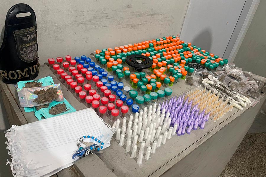 Durante a abordagem, os guardas encontraram uma sacola contendo drogas já fracionadas para venda, além de um caderno com anotações relacionadas à contabilidade do tráfico.