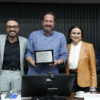 A entrega do certificado com a doação ao município, que foi realizada em 28 de fevereiro, durante o lançamento do projeto educacional “Sustentabilidade para a vida”, no Cemur. O prefeito Aprígio aproveitou a ocasião para agradecer a empresa farmacêutica.